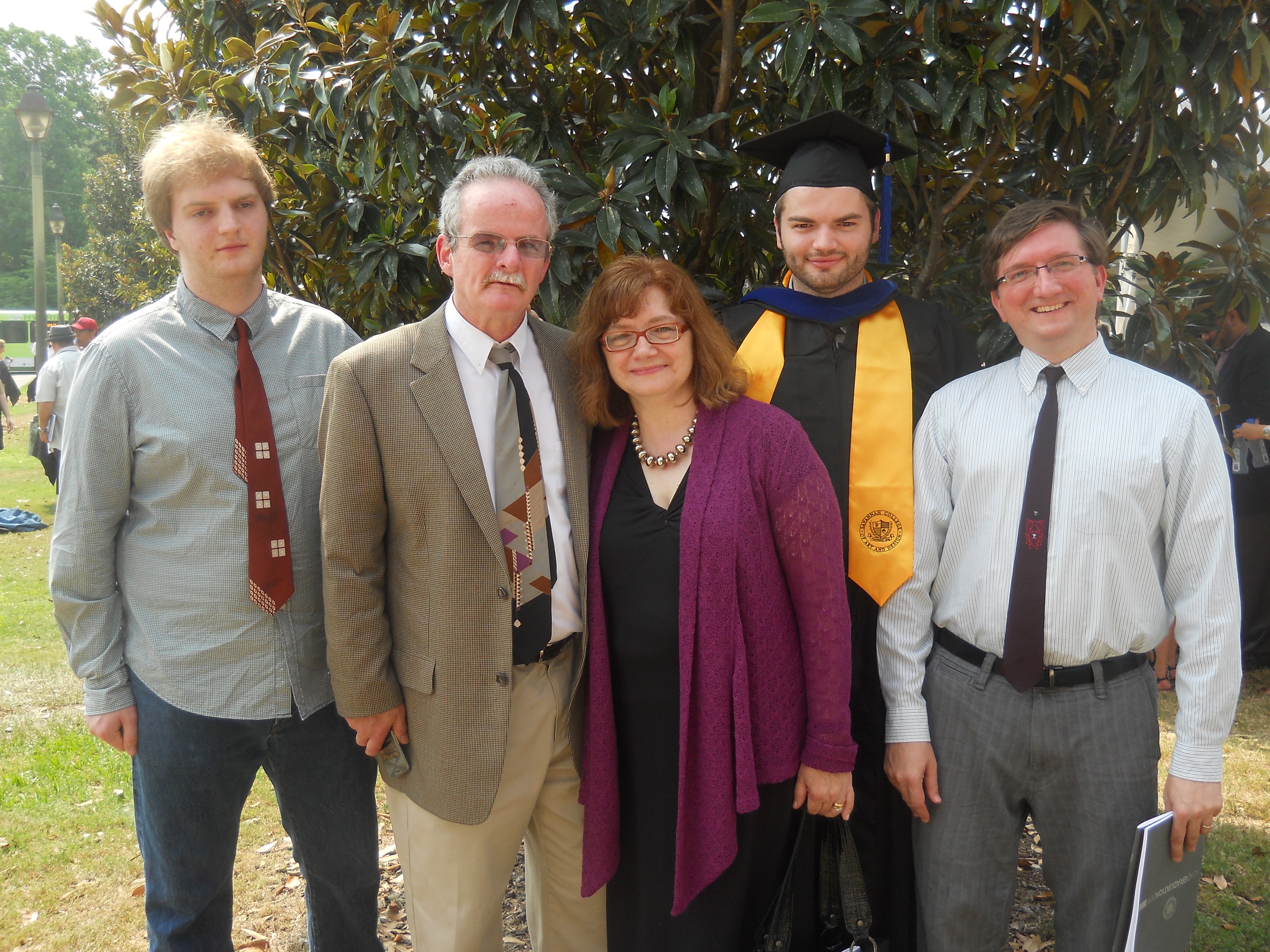 June, 2012, just two days before my second (or third) stroke. I am posing with my three sons and Suzanne in Savannah, Georgia, where Chris had just graduated from the Savannah College of Art & Design. (Note the facial droop.)