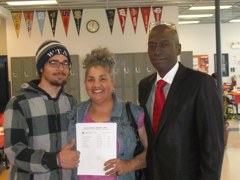 Dr. Kent Nolen, West Town Academy principal, with graduating senior and high-honors recipient Antoine, and his proud mom. June, 2014.